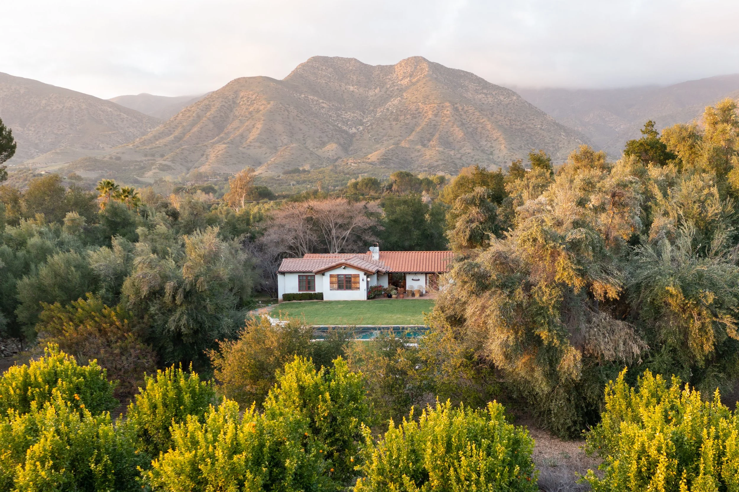 This spectacular Spanish-style farmhouse is set amongst the organge groves in the East End of Ojai. The main house features original terra cotta tile floors, stucco walls, and sand blasted, vaulted ceilings with exposed beams. Fiber-art wall hangings were sourced from local Ojai artist Sally England to add texture and a mid-century warmth. Every room in the house opens directly to a patio and over an acre of landscaped gardens-anchored by and expansive 40-foot salt water pool framed by stones.